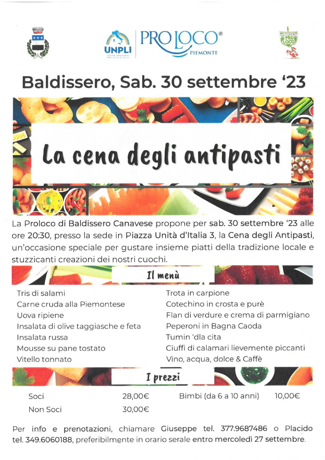 La Proloco di Baldissero Canavese propone per sabato 30 settembre 2023 alle ore 20.30, presso la sede in Piazza Unità d'Italia 3, la Cena degli Antipasti, un' occasione speciale per gustare insieme piatti della tradizione locale e stuzzicanti creazioni dei nostri cuochi.