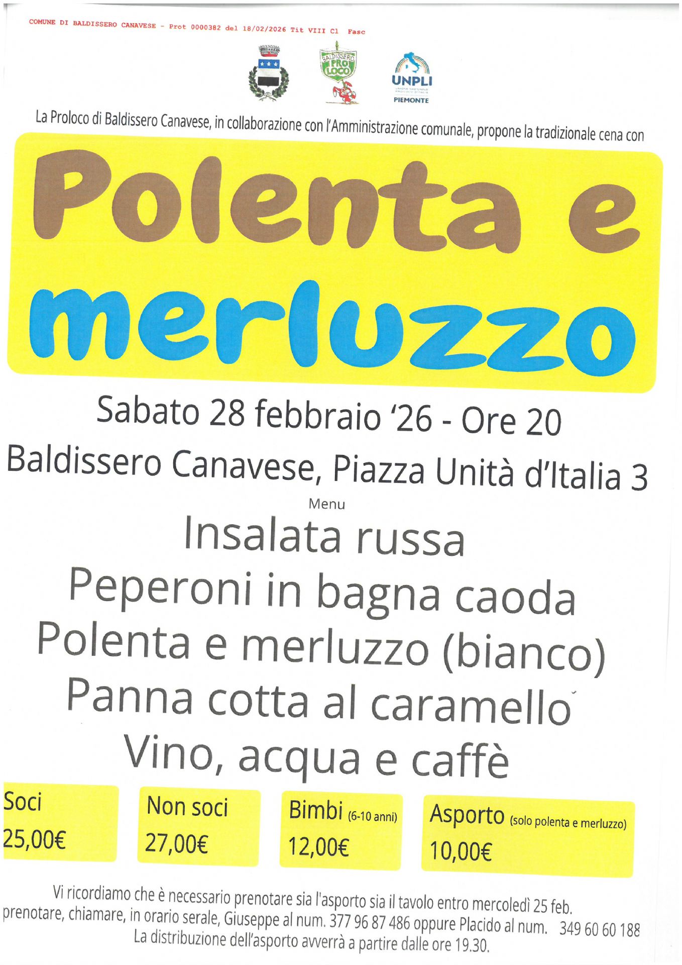 LA PRO LOCO Organizza per Sabato 28 febbraio 2026 ore 20.00 in Piazza Unità d'Italia la cena :