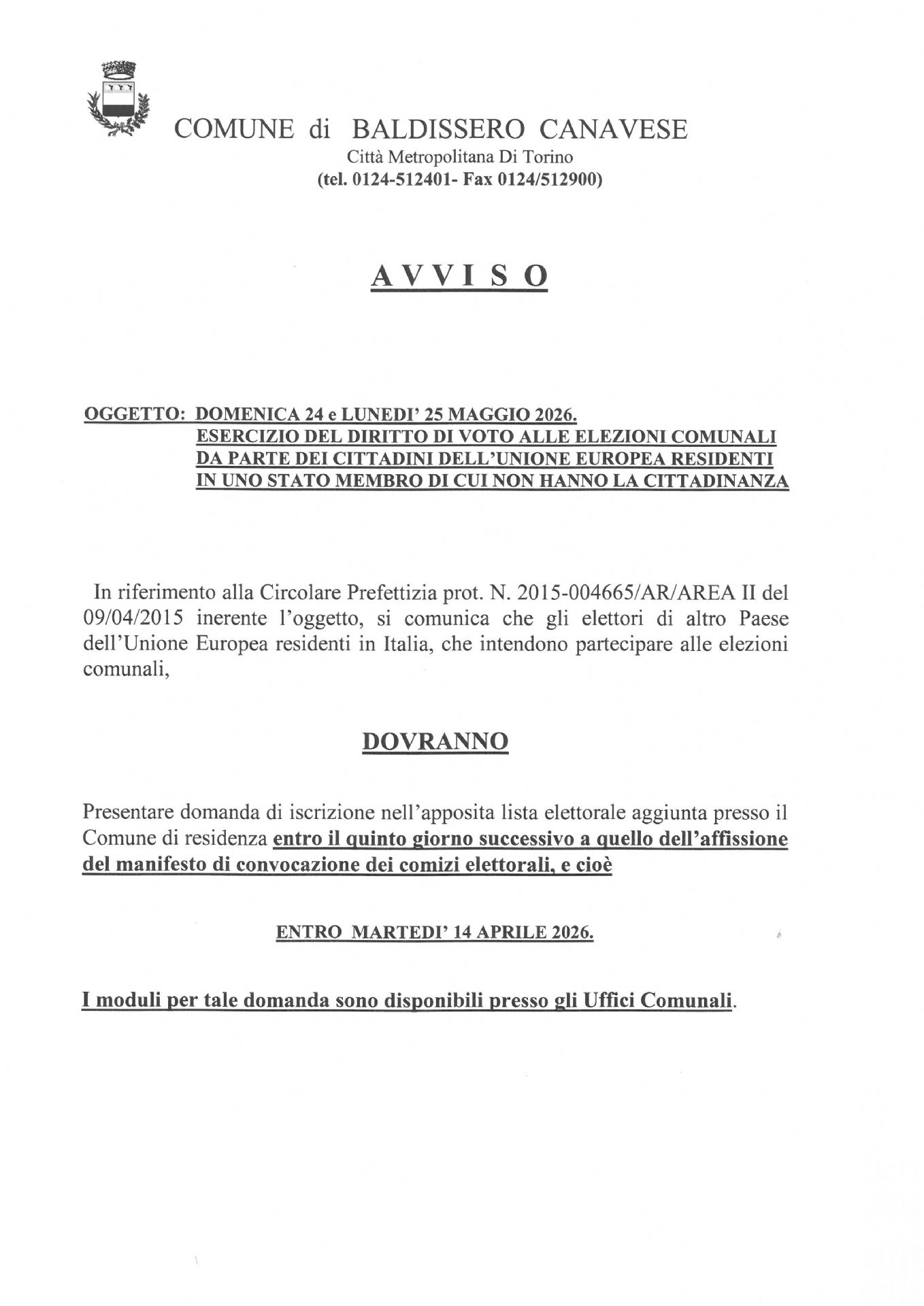 I Cittadini Europei senza cittadinanza italiana e residenti nel Comune di Baldissero possono votare per l'elezione del Sindaco per Domenica 24 e Lunedì 25 Maggio 2026 , Presentando la richiesta al voto in comune entro martedì 14 aprile 2026.