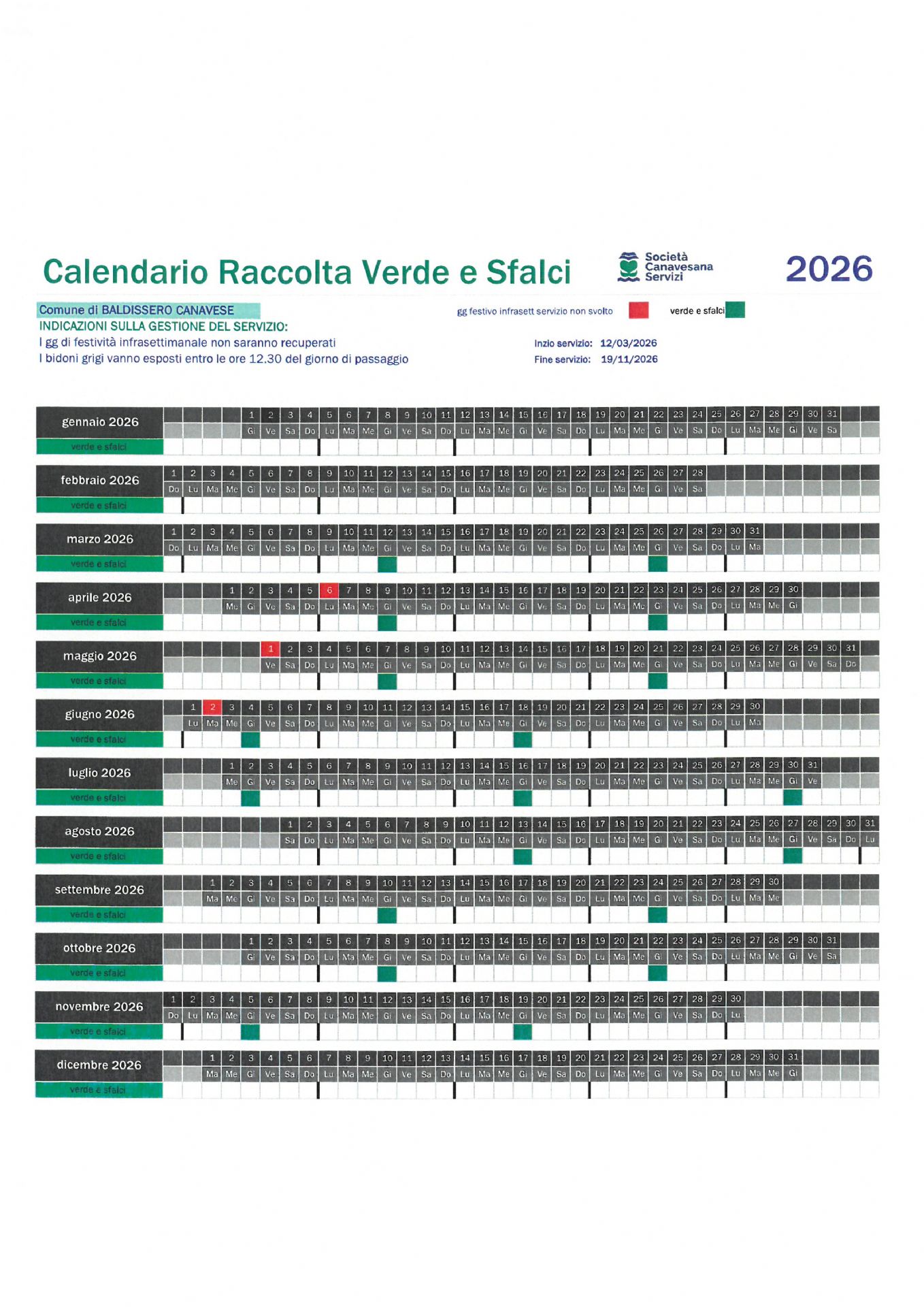 Raccolta rifiuti verde e sfalci 2026